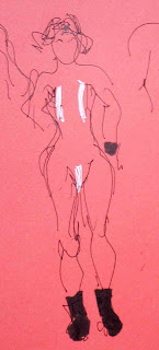 'Shit,' says Rosie, my drawing compadre for the evening. Several times. I understand why. It's a technical and observational scramble - the movements so fleeting, drawing materials so wayward - what are we trying to do here, squashed up on a sofa, stage left, in semi-darkness? 'Oh shit.'